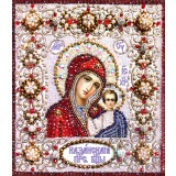 Богородица Жировицкая: плотная атласная ткань с нанесенной авторской схемой, лазурит, агат, коралл прессованный, аметист, керамические розочки, хрусталь, стразы на нити, металлическая фурнитура, бисер (Чехия), бисер MILL HILL (США), трунцал, жесткая канитель, игла, подарочный пакет с фотографией вышитой иконы и схемой расположения бусин, пошаговая инструкция по оплетению бусин с фотографиями