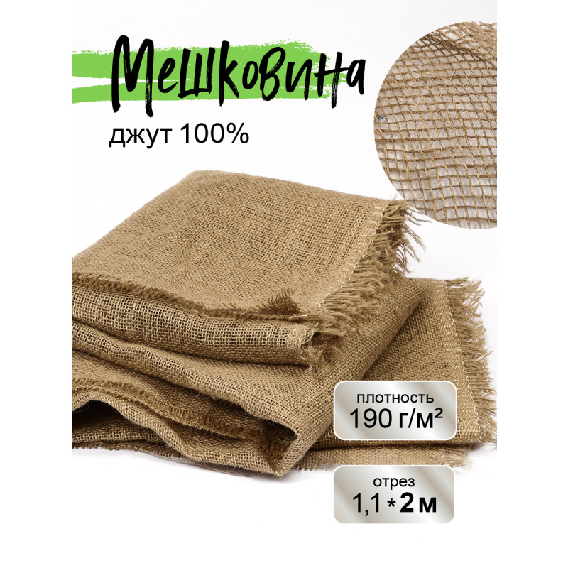 Мешковина – прочный материал, изготовленный из натуральных волокон джута и льна. Не требует специального ухода, способен сохранять свою целостность под воздействием агрессивной среды. Ткань золотисто – коричневого цвета, плохо намокает, не подвержена гниению, жароустойчива.Материал широко применяется в декоре, интерьере, а также в качестве упаковочного материала (из мешковины делают шторы, скатерти, чехлы для мебели, оформляют интерьеры художественных студий и театров . В декоративном искусстве – для создания кукол и других поделок.Длина отреза: 2 метра Ширина: 110 см.Плотность 190 г/м2. Плотность плетения 33×25.