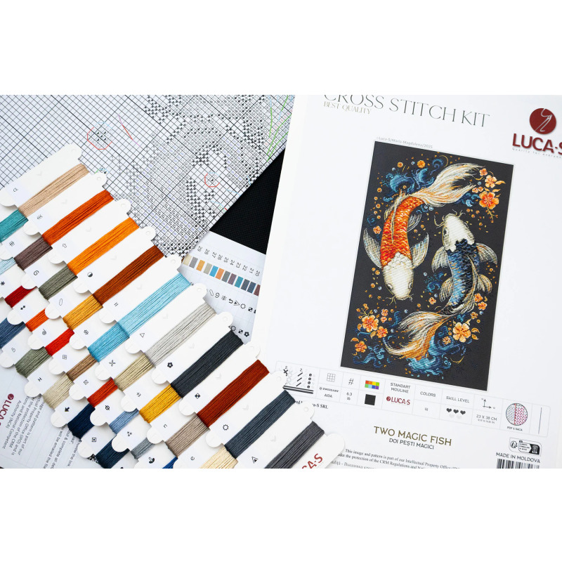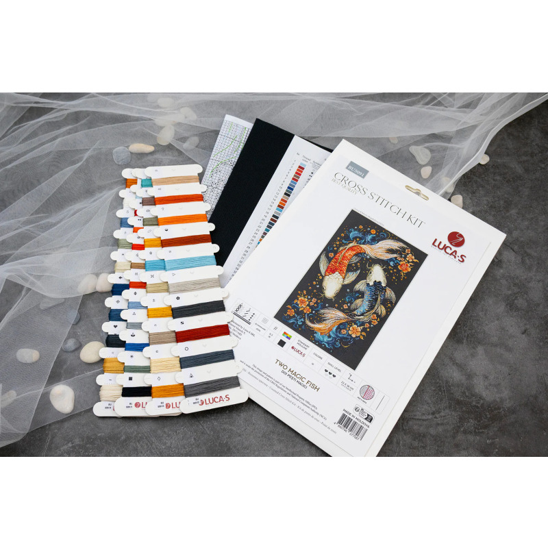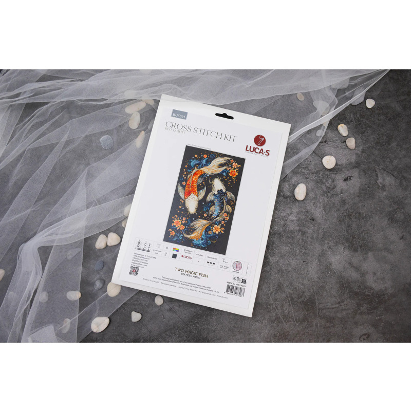 Набор для вышивания крестом Luca-S «Две волшебные рыбки», артикул BU5091. Размер готовой работы: 23×38 см Размер в крестиках: 147×237 Количество цветов: 41 Нити: мулине Luca-S, 100% хлопок Основа (ткань): канва Zweigart Aida 16 ct (720), отрез 37×52 см Иглы: для вышивания №26 — 2 шт.; нитевдеватель Схема: частично цветная, бэкстич выделен цветом; 6 листов формата A3 Уровень сложности: средний (3/5)