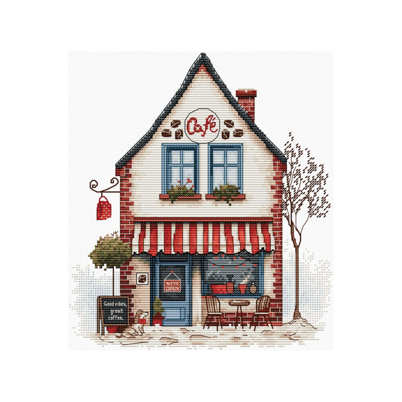 Набор для вышивания крестом «Добро пожаловать в кофейню» от бренда Luca-S, артикул B1427. Размер готовой работы: 18×20 см Размер в крестиках: 114×128 Количество цветов: 39 Нити: мулине Luca-S, 100% хлопок Основа (ткань): канва Zweigart Aida 16 ct, белая (100/101), отрез 32 × 34 см Игла: для вышивания №26 — 1 шт. Схема: частично цветная, бэкстич выделен цветом; 4 листа формата A3 Уровень сложности: средний (3/5)
