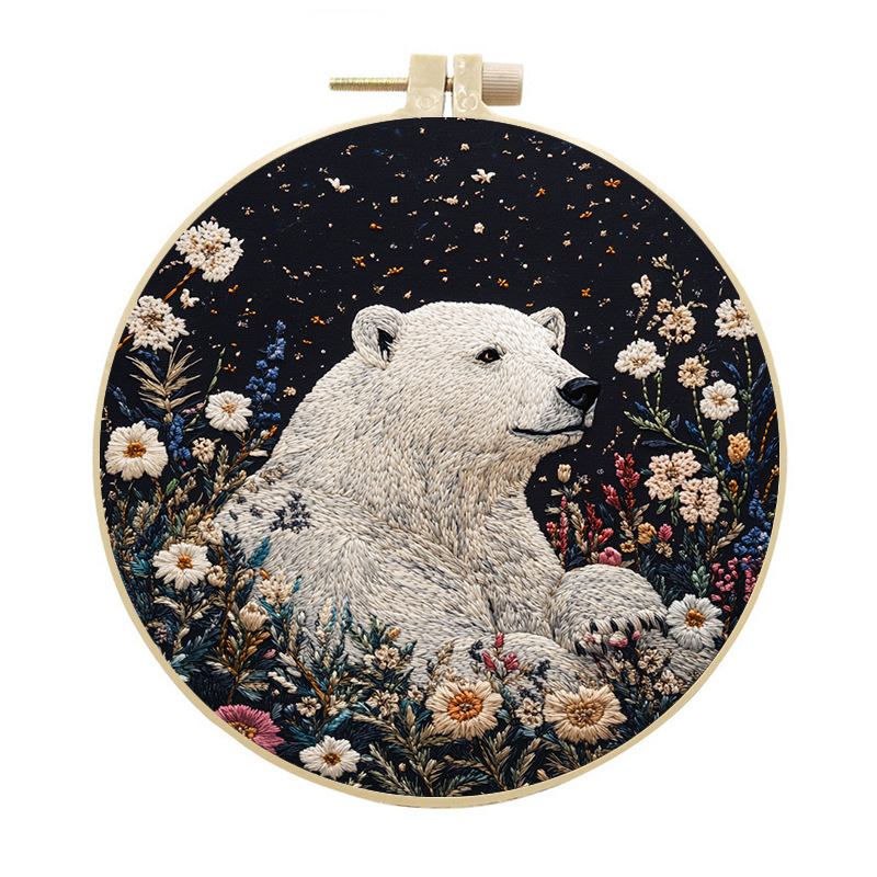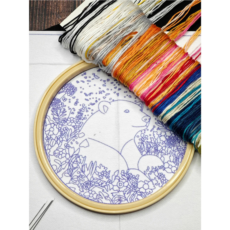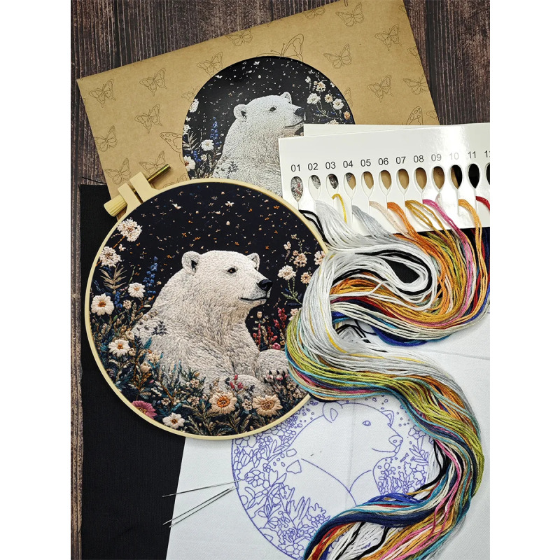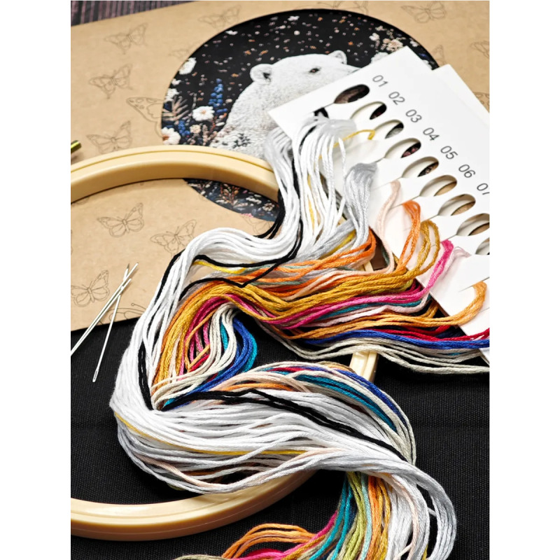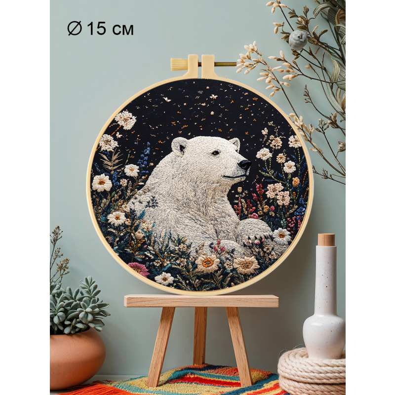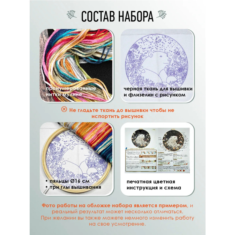 Набор для вышивания гладью "Белый медведь" от бренда YoHobby. Размер готовой работы 15 см. В набор входит качественное мулине 20 цветов, темно-синяя ткань для вышивки и водорастворимый флизелин с нанесенным рисунком, три иглы для вышивания, пяльцы с винтом и подробная инструкция с картинками. Каждая нить мулине на палетке состоит из 6 нитей: если по инструкции элемент вышивается в 2 нити - то берем одну и складываем пополам, если по инструкции в 4 нити - то это две нити с палетки, также сложенные пополам. Вышивка выполняется от центра к краю, также обращайте внимание на перекрывающиеся элементы. Готовый результат может слегка отличаться от печатного фото работы, которая приведена для примера и понимания схемы. Обратите, пожалуйста, внимание! Не мочите и не гладьте флизелин до вышивки во избежание порчи разметки. Отделите его от подложки и наклейте на ткань, затем заправьте ткань в пяльцы.