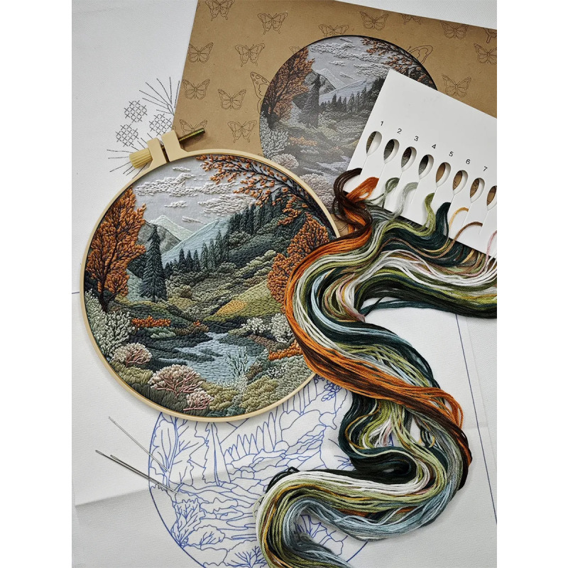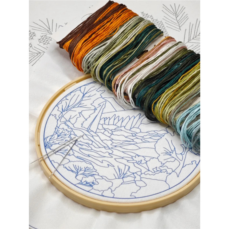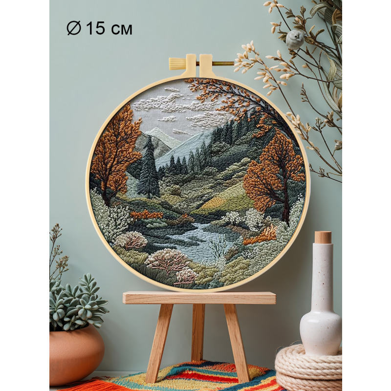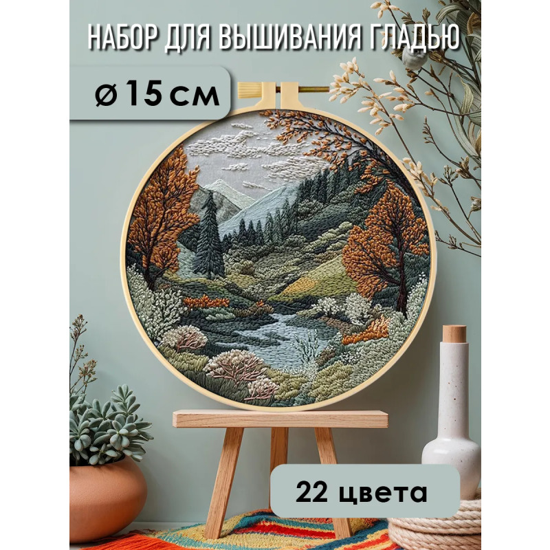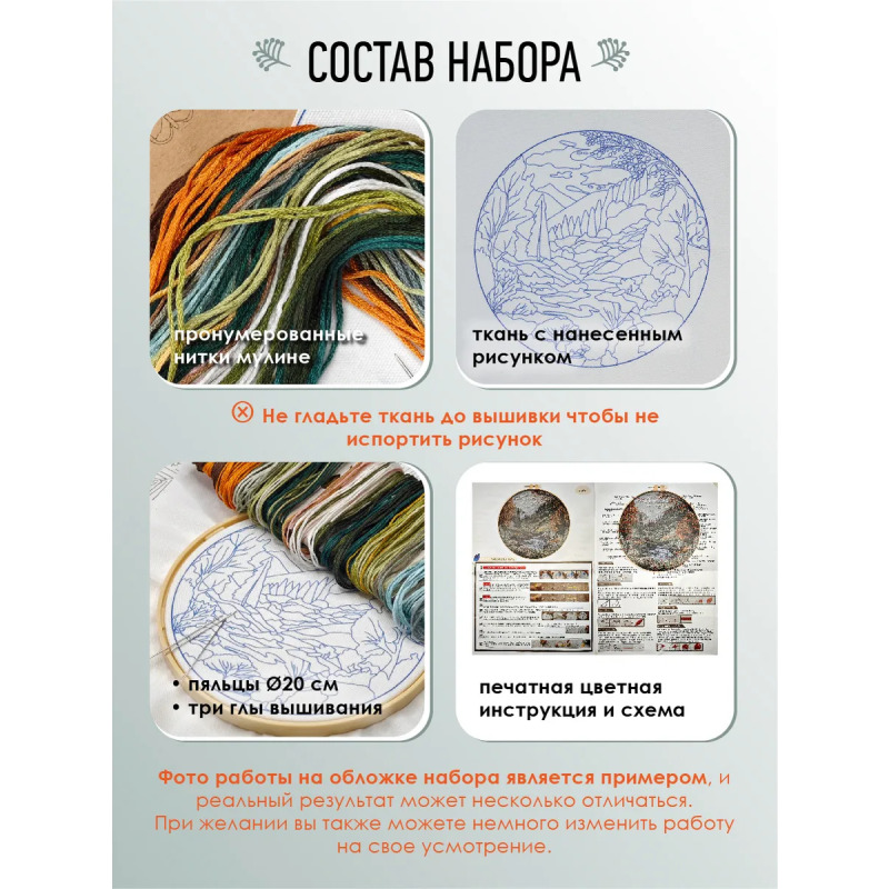 Набор для вышивания гладью "Осень в горах" от бренда YoHobby. Размер готовой работы 15 см. В набор входит качественное мулине 22 цвета, ткань с нанесенным рисунком, три иглы для вышивания, пяльцы с винтом и подробная инструкция с картинками. Каждая нить мулине на палетке состоит из 6 нитей: если по инструкции элемент вышивается в 2 нити - то берем одну и складываем пополам, если по инструкции в 4 нити - то это две нити с палетки, также сложенные пополам. Вышивка выполняется от центра к краю, также обращайте внимание на перекрывающиеся элементы. Готовый результат может слегка отличаться от печатного фото работы, которая приведена для примера и понимания схемы. Обратите, пожалуйста, внимание! Рисунок на ткани выполнен смываемыми чернилами, поэтому гладить и мочить до вышивки ткань не следует во избежание порчи разметки.