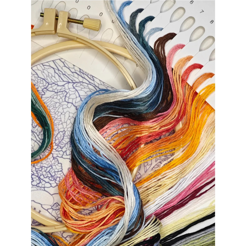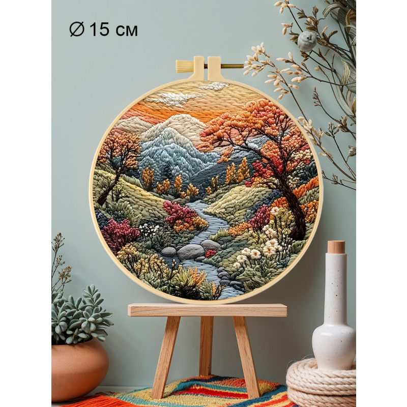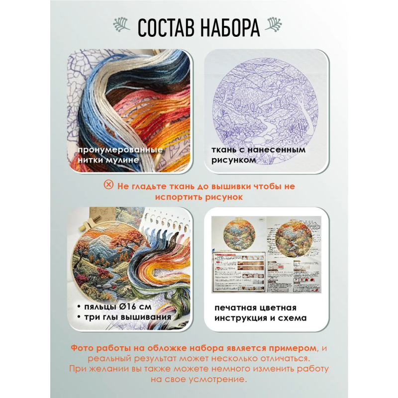 Набор для вышивания гладью "Осень" от бренда YoHobby. Размер готовой работы 15 см. В набор входит качественное мулине 27 цветов, ткань с нанесенным рисунком, три иглы для вышивания, пяльцы с винтом и подробная инструкция с картинками. Каждая нить мулине на палетке состоит из 6 нитей: если по инструкции элемент вышивается в 2 нити - то берем одну и складываем пополам, если по инструкции в 4 нити - то это две нити с палетки, также сложенные пополам. Вышивка выполняется от центра к краю, также обращайте внимание на перекрывающиеся элементы. Готовый результат может слегка отличаться от печатного фото работы, которая приведена для примера и понимания схемы. Обратите, пожалуйста, внимание! Рисунок на ткани выполнен смываемыми чернилами, поэтому гладить и мочить до вышивки ткань не следует во избежание порчи разметки.
