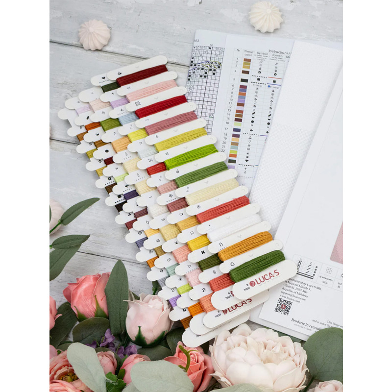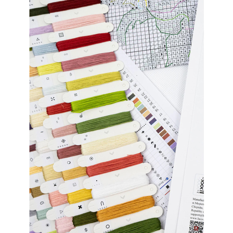 Размер: 25 × 35 см Количество крестиков: 160 × 220 Цветов: 56 Нитки: Luca-S, 100% хлопок Канва: Zweigart Aida 16 ct, белая (100/101), 39 × 48 см Иглы для вышивания №26 – 2 шт. Схема: черно-белая, 8 листов формата A3 Уровень сложности: 3/5