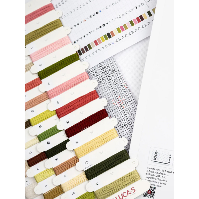 Размер: 24 × 34 см Количество крестиков: 153 × 212 Цветов: 44 Нитки: Luca-S, 100% хлопок Канва: Zweigart Aida 16 ct, белая (100/101), 38 × 48 см Иглы для вышивания №26 – 2 шт. Схема: черно-белая, 8 листов формата A3 Уровень сложности: 3/5