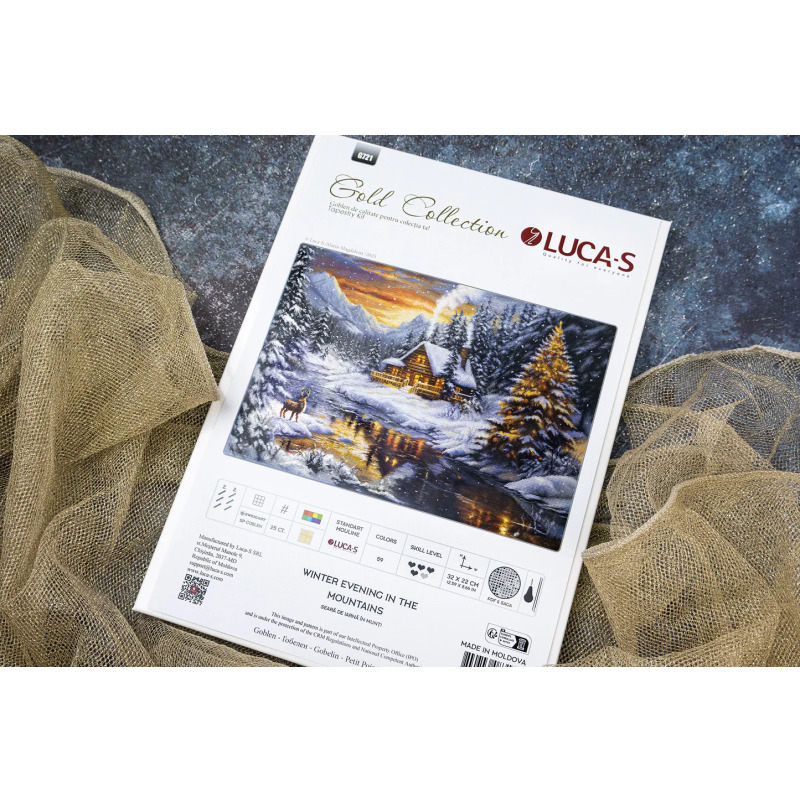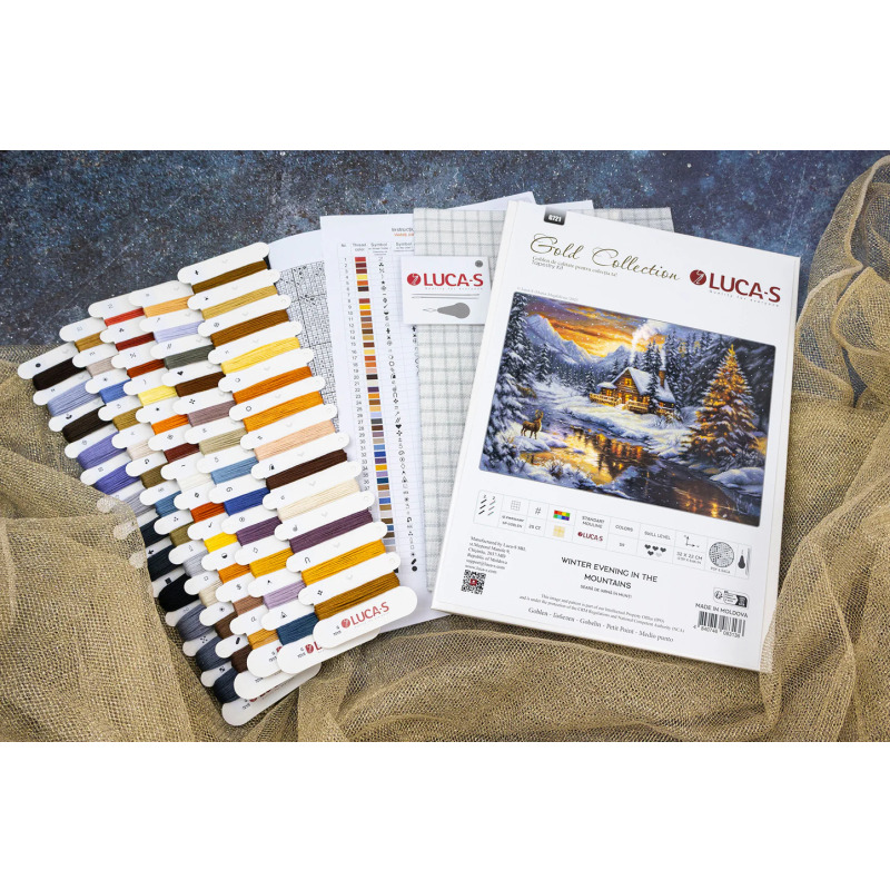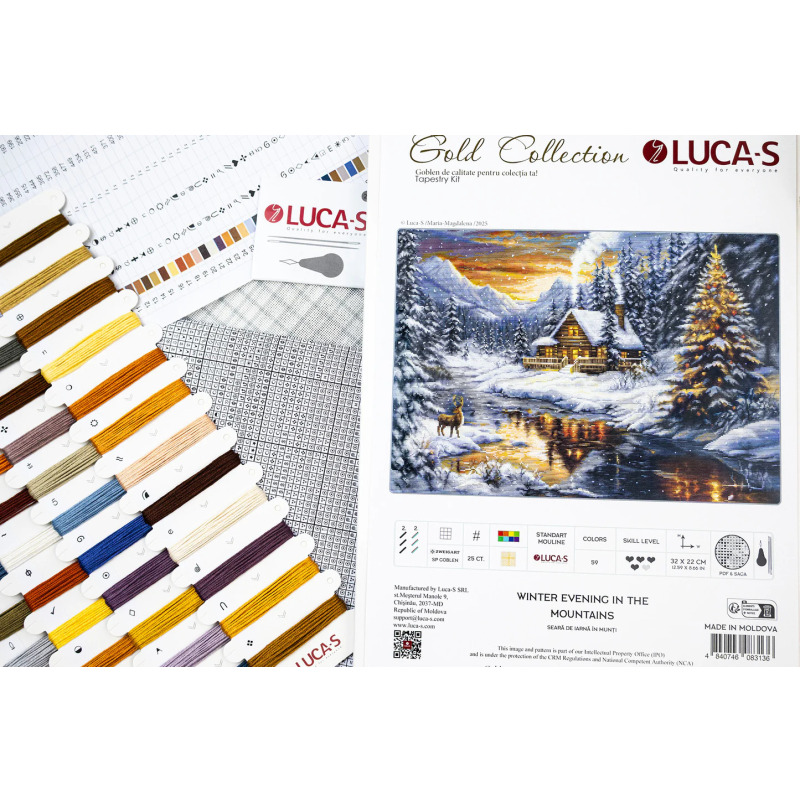Набор для вышивания гобеленом Luca-S GOLD «Зимний вечер в горах», артикул G721 Размер: 32 × 22 см Размер в стежках: 320 × 220 Количество цветов: 59 Нити: Luca-S, 100% хлопок Канва: Zweigart 25 ct (№2169), 46 × 36 см Иглы для вышивания №26 — 2 штуки, 1 нитковдеватель (в конверте) Схема: черно-белая, 12 листов формата A3 Уровень сложности: 4 из 5 Техника: гобелен