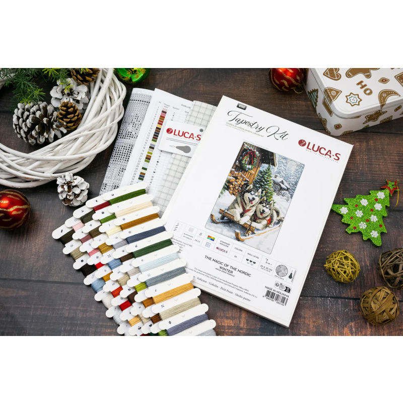 Набор для вышивания гобеленом Luca-S «Магия северной зимы», артикул G722 Размер: 20 × 30 см Размер в стежках: 200 × 300 Количество цветов: 55 Нити: Luca-S, 100% хлопок Канва: Zweigart 25 ct (№1219), 34 × 44 см Иглы для вышивания №26 — 2 штуки, 1 нитковдеватель (в конверте) Схема: черно-белая, 9 листов формата A3 Уровень сложности: 3 из 5 Техника: гобелен