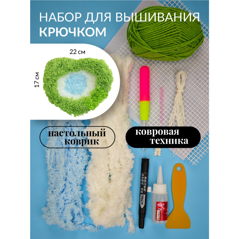 Набор ковровой вышивки крючком - коврик/подставка под кружку В комплектации набора : Набор пряжи разной фактуры и цветов; Сетка для вышивания; Фетр для обработки задней стороны; Схема вышивки; Специальный крючок для ковровой вышивки; Маркер для переноса рисунка на сетку; Пластиковая игла; Металлическая игла и нитки для пришивания фетра; Клей и шпатель для обработки задней поверхности