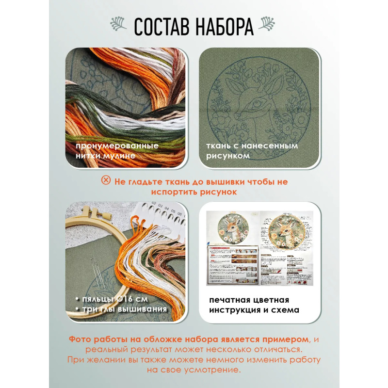 Набор для вышивания гладью "Олененок" от бренда YoHobby. Размер готовой работы 15 см. В набор входит качественное мулине 20 цветов, зеленая ткань с нанесенным рисунком, три иглы для вышивания, пяльцы с винтом и подробная инструкция с картинками. Каждая нить мулине на палетке состоит из 6 нитей: если по инструкции элемент вышивается в 2 нити - то берем одну и складываем пополам, если по инструкции в 4 нити - то это две нити с палетки, также сложенные пополам. Вышивка выполняется от центра к краю, также обращайте внимание на перекрывающиеся элементы. Готовый результат может слегка отличаться от печатного фото работы, которая приведена для примера и понимания схемы. Обратите, пожалуйста, внимание! Рисунок на ткани выполнен смываемыми чернилами, поэтому гладить и мочить до вышивки ткань не следует во избежание порчи разметки.