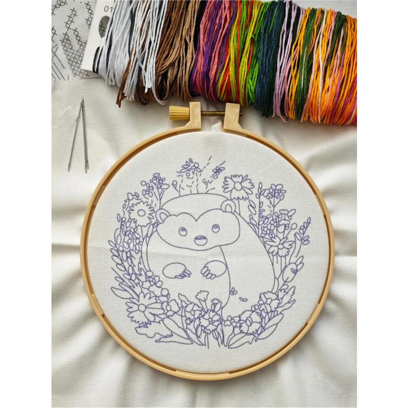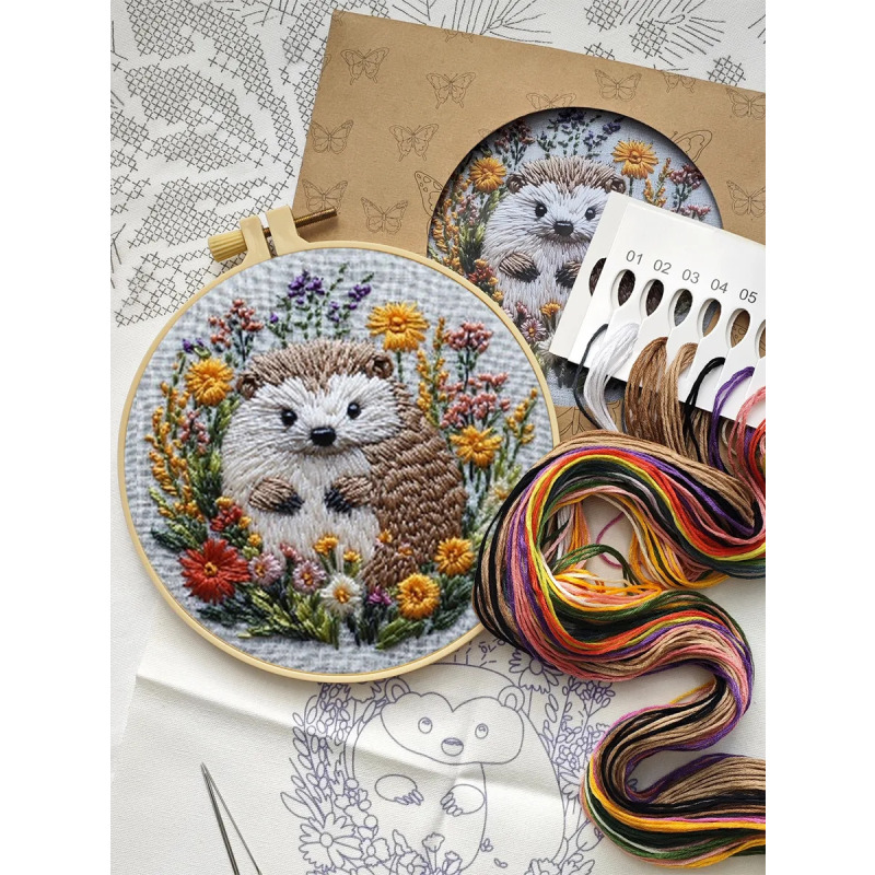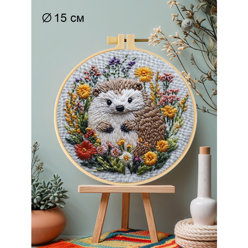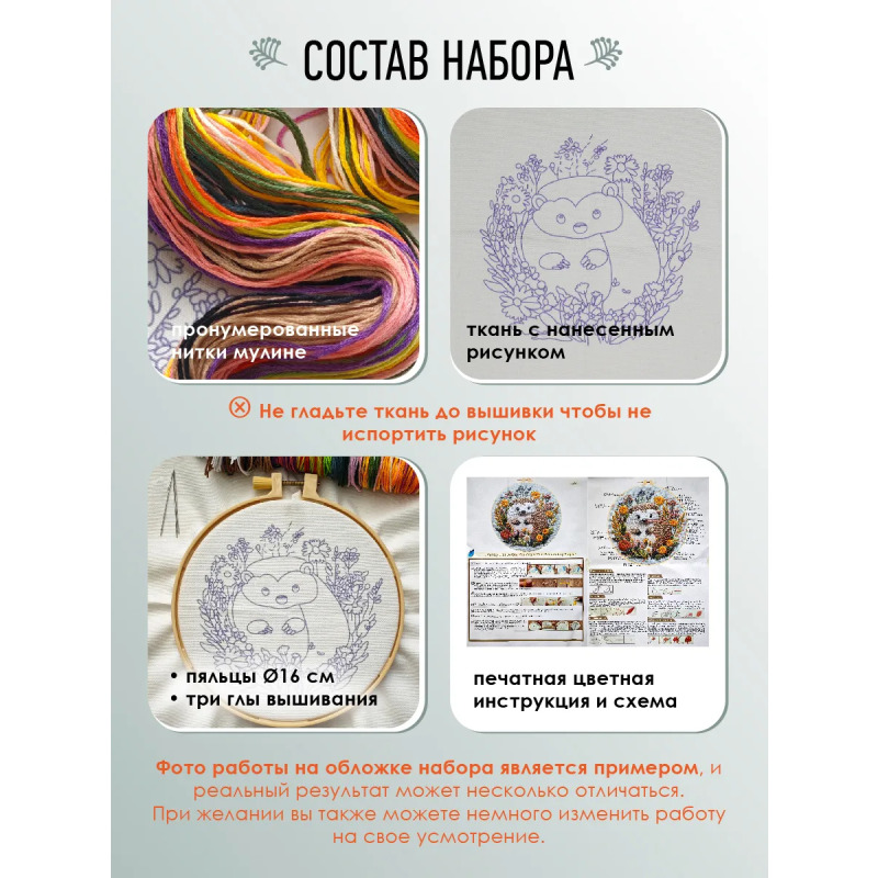 Набор для вышивания гладью "Еж" от бренда YoHobby. Размер готовой работы 15 см. В набор входит качественное мулине 19 цветов, ткань с нанесенным рисунком, три иглы для вышивания, пяльцы с винтом и подробная инструкция с картинками. Каждая нить мулине на палетке состоит из 6 нитей: если по инструкции элемент вышивается в 2 нити - то берем одну и складываем пополам, если по инструкции в 4 нити - то это две нити с палетки, также сложенные пополам. Вышивка выполняется от центра к краю, также обращайте внимание на перекрывающиеся элементы. Готовый результат может слегка отличаться от печатного фото работы, которая приведена для примера и понимания схемы. Обратите, пожалуйста, внимание! Рисунок на ткани выполнен смываемыми чернилами, поэтому гладить и мочить до вышивки ткань не следует во избежание порчи разметки.
