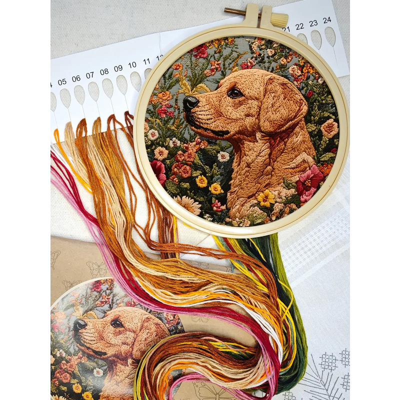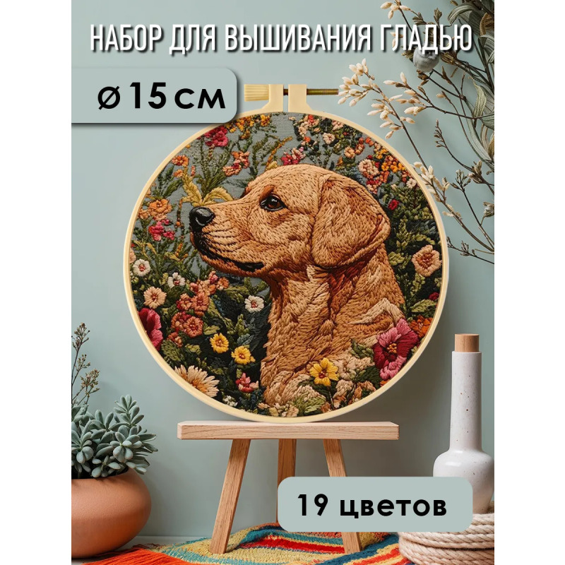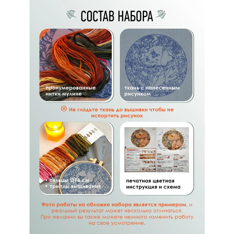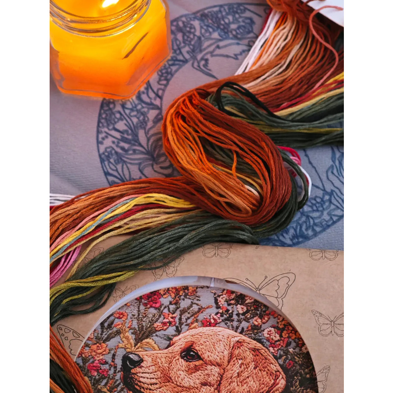 Набор для вышивания гладью "Пес" от бренда YoHobby. Размер готовой работы 15 см. В набор входит качественное мулине 19 цветов, серая ткань с нанесенным рисунком, три иглы для вышивания, пяльцы с винтом и подробная инструкция с картинками. Каждая нить мулине на палетке состоит из 6 нитей: если по инструкции элемент вышивается в 2 нити - то берем одну и складываем пополам, если по инструкции в 4 нити - то это две нити с палетки, также сложенные пополам. Вышивка выполняется от центра к краю, также обращайте внимание на перекрывающиеся элементы. Готовый результат может слегка отличаться от печатного фото работы, которая приведена для примера и понимания схемы. Обратите, пожалуйста, внимание! Рисунок на ткани выполнен смываемыми чернилами, поэтому гладить и мочить до вышивки ткань не следует во избежание порчи разметки.