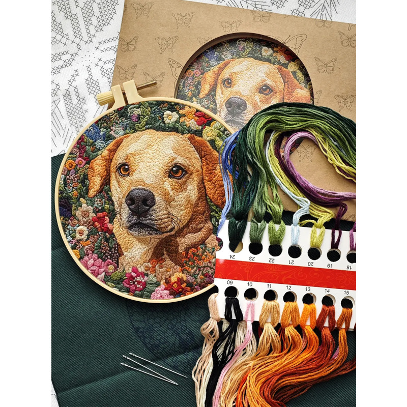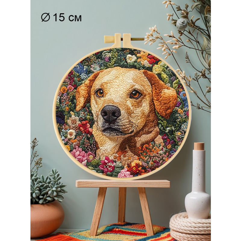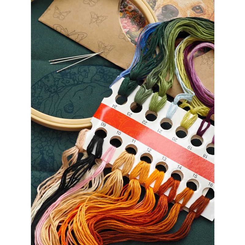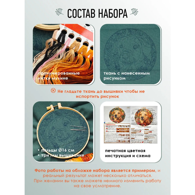 Набор для вышивания гладью "Верный пес" от бренда YoHobby. Размер готовой работы 15 см. В набор входит качественное мулине 27 цветов, зеленая ткань с нанесенным рисунком, три иглы для вышивания, пяльцы с винтом и подробная инструкция с картинками. Каждая нить мулине на палетке состоит из 6 нитей: если по инструкции элемент вышивается в 2 нити - то берем одну и складываем пополам, если по инструкции в 4 нити - то это две нити с палетки, также сложенные пополам. Вышивка выполняется от центра к краю, также обращайте внимание на перекрывающиеся элементы. Готовый результат может слегка отличаться от печатного фото работы, которая приведена для примера и понимания схемы. Обратите, пожалуйста, внимание! Рисунок на ткани выполнен смываемыми чернилами, поэтому гладить и мочить до вышивки ткань не следует во избежание порчи разметки.