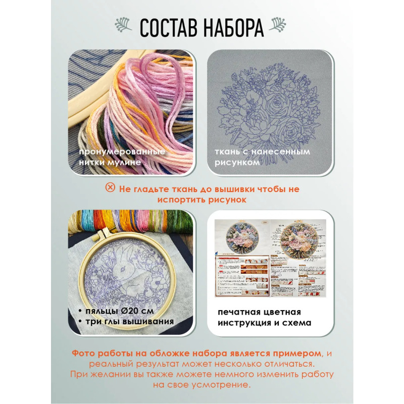 Набор для вышивания гладью "Нежный букет" от бренда YoHobby. Размер готовой работы 20 см. В набор входит качественное мулине 20 цветов, светло-серая ткань с нанесенным рисунком, три иглы для вышивания, пяльцы с винтом и подробная инструкция с картинками. Каждая нить мулине на палетке состоит из 6 нитей: если по инструкции элемент вышивается в 2 нити - то берем одну и складываем пополам, если по инструкции в 4 нити - то это две нити с палетки, также сложенные пополам. Вышивка выполняется от центра к краю, также обращайте внимание на перекрывающиеся элементы. Готовый результат может слегка отличаться от печатного фото работы, которая приведена для примера и понимания схемы. Обратите, пожалуйста, внимание! Рисунок на ткани выполнен смываемыми чернилами, поэтому гладить и мочить до вышивки ткань не следует во избежание порчи разметки.
