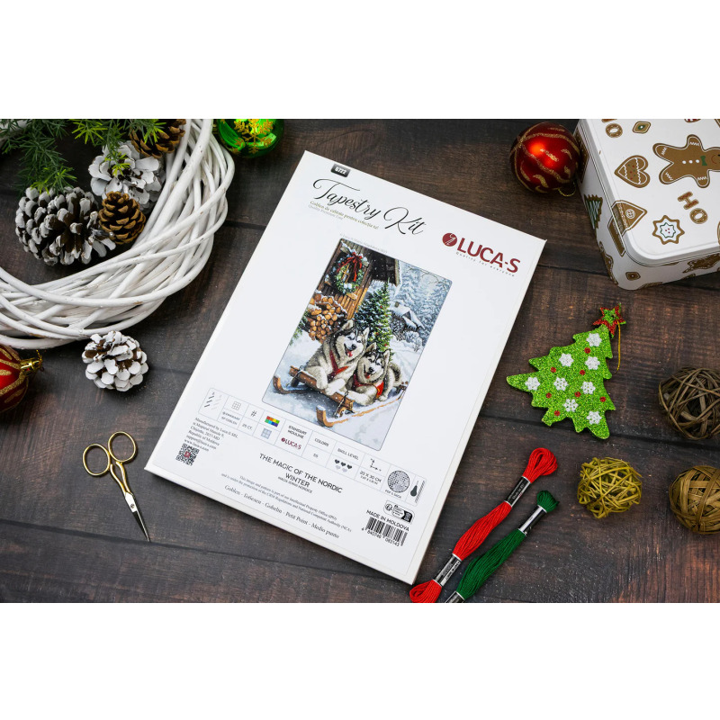 Набор для вышивания гобеленом Luca-S «Магия северной зимы», артикул G722 Размер: 20 × 30 см Размер в стежках: 200 × 300 Количество цветов: 55 Нити: Luca-S, 100% хлопок Канва: Zweigart 25 ct (№1219), 34 × 44 см Иглы для вышивания №26 — 2 штуки, 1 нитковдеватель (в конверте) Схема: черно-белая, 9 листов формата A3 Уровень сложности: 3 из 5 Техника: гобелен